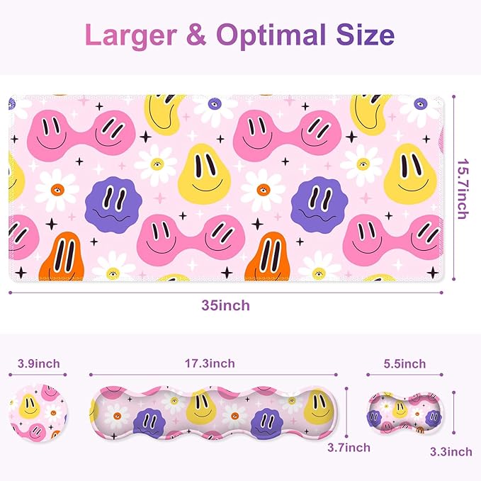 Gaming Mouse Pad Keyboard Wrist Support, 4 in1 Mousepad with Wrist Keyboard Rest, Computer Desk Mat, Non-Slip Desk Pad Protector with Memory Foam Easy Typing Pain Relief I Cute Hippie Smiley