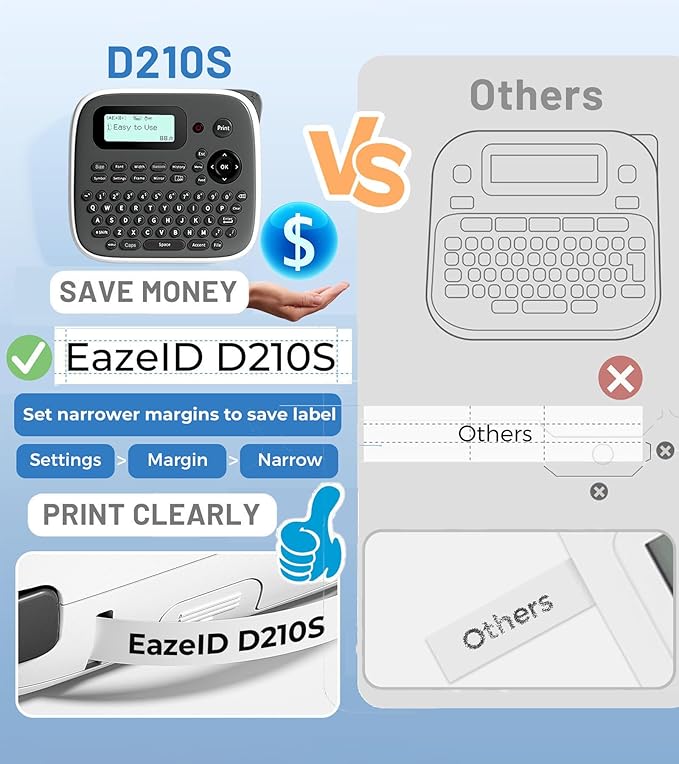 - Efficient Usage Tips : To reduce label tape costs, the EazeID D210S label maker with keyboard is recommended to set the label margin to "Narrow" For printing different labels, utilize the multi-copy editing one-touch key to continuously edit and print up to 55 different labels. When printing multiple identical labels, it is advisable to print them at once and then cut them individually