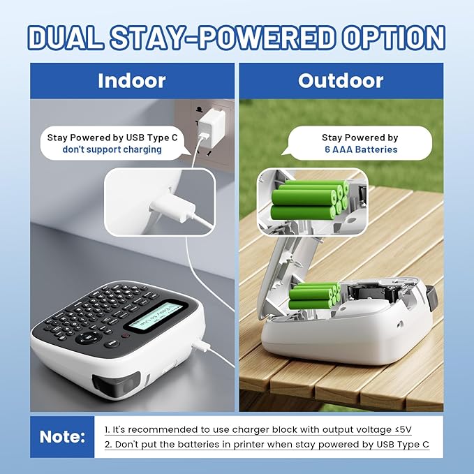 - Power Supply : The EazeID D210S portable label maker machine with tape can stay powered by either the Type-C (included) or 6 AAA batteries (not included), providing flexibility to use it anywhere and any time