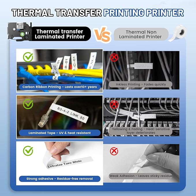 - Durable and Long-lasting Labels : The thermal transfer label maker machine produces laminated labels waterproof, abrasion, fading, and temperature changes. These labels are perfect for both indoor and outdoor use. The label maker comes with a 1-Pack black on white label tape measuring 1/2 inch wide x 13 feet long