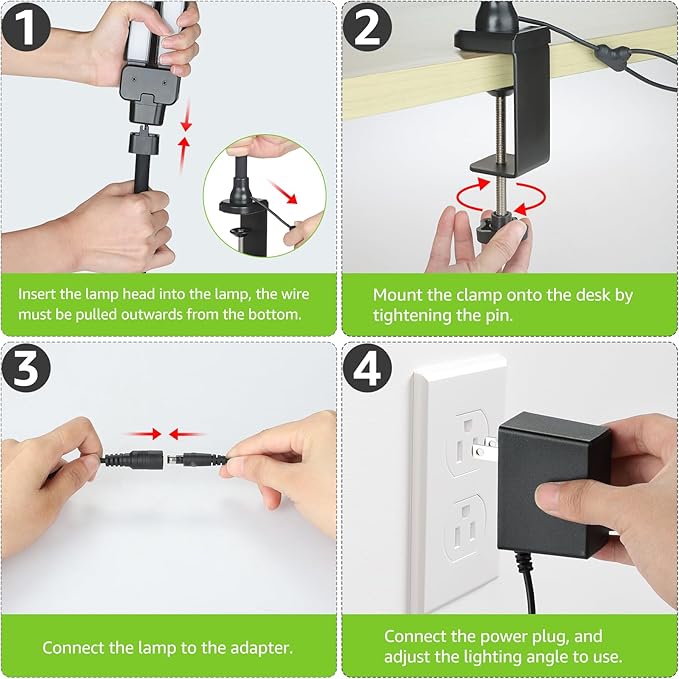 - Flexible Gooseneck and Easy Installation: The 360° gooseneck and 180° lamp head provide flexibility to adjust the lamp to your desired angle, ensuring targeted and efficient lighting. The installation process is simple, requiring no additional tools. Don't forget to remove the protective film from the lamp head before use. The sturdy metal clamp secures effortlessly to tabletop edges up to 2.9 inches thick, with a silicone pad to prevent scratching