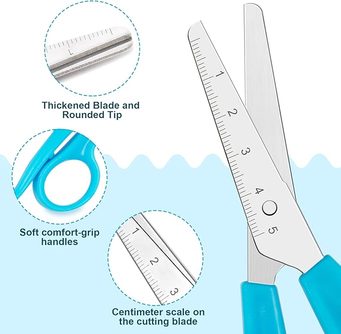 - Especially for Kids: school scissors for kids age 8-12 feature sturdy, flat-ground stainless steel blades with safe rounded tips. Soft grip handles with the right size of holes of scissors for school, make children use it with much comfort. The centimeter scale on the blade is convenient for kids to cut a specified length. The sharp stainless Steel blades provide you with a perfect user experience. Blunt tip scissors for kids are smooth for easy cleaning and cutting. Our scissors for school kids allow for either left- or right-handed use.