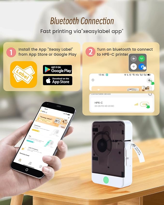 - Easy to Use-Bluetooth Connection: Vretti Small label maker compatible with IOS & Android Phones, connecting to your smartphone is a breeze. Simply pair your device, customize your labels, and then you can get a high-quality label printed instantly. Please note: The thermal label maker needs to download the "xeasylabel" app from Google Play or the App Store.