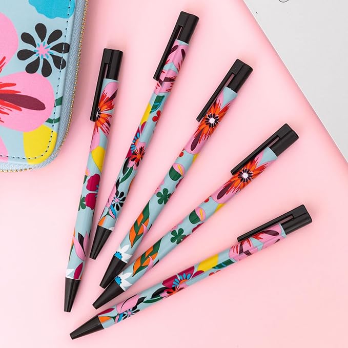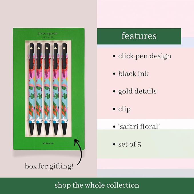 kate spade new york Black Ink Pen Set of 5, Cute Click Pens, Plastic Retractable Pens for Writing and Journaling (Safari Floral)