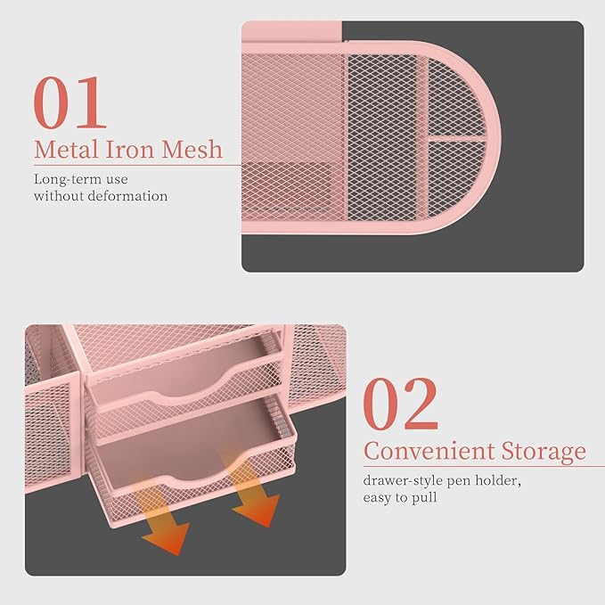 SUPEASY Mesh Desk Organizer, Desk Organizers and Accessories, Pen Holder with Drawers, Pencil Holder for Desk with 2 Drawer for Office Supplies, Pink