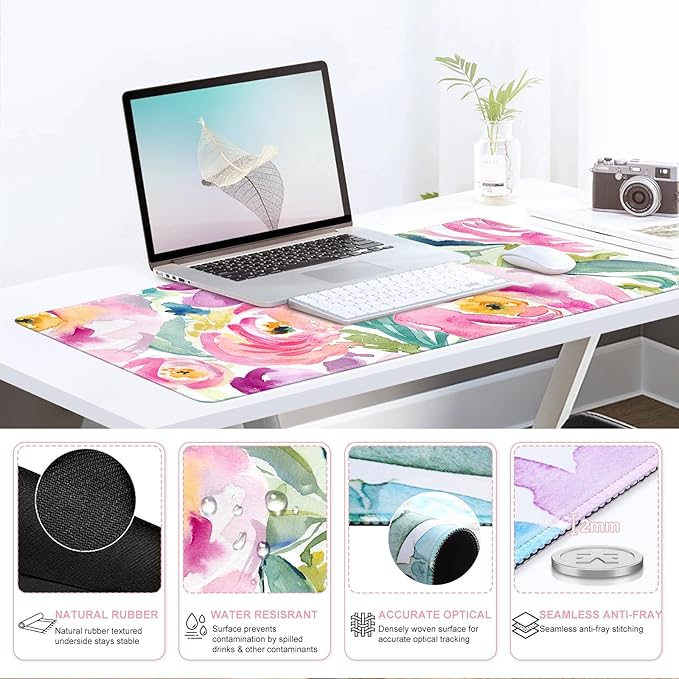iCasso Mouse Pad with Wrist Rest,Large Desk Mat Set,Ergonomic Keyboard Pad with Wrist Support,Non-Slip Mouse Mat for Women,Cute Floral Computer Mat for Home Office Gaming (Watercolor Flowers)