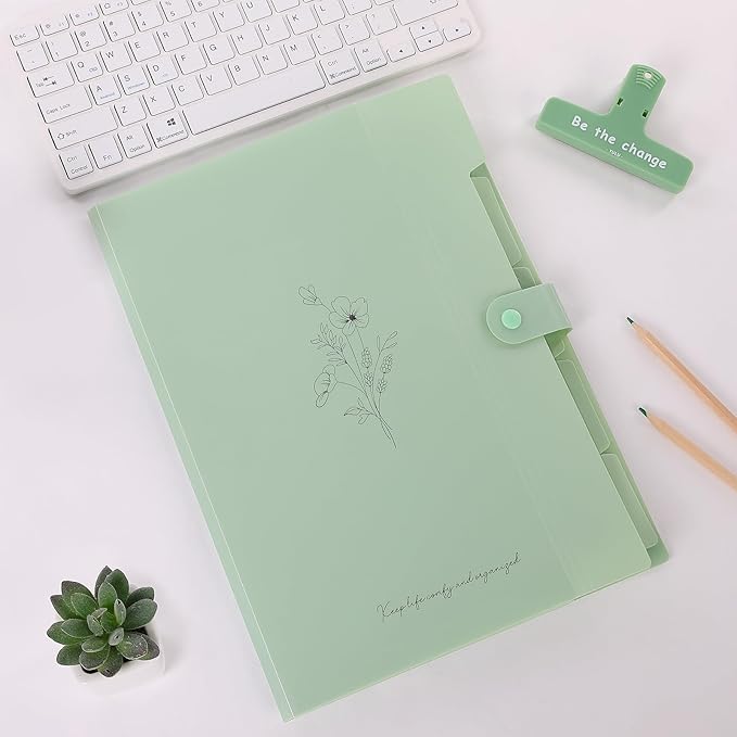 SKYDUE Expanding File Folder with 5 Pockets, Aesthetic Accordion File Organizer, Portable Document Paper Bill Receipt Organizer, School Office Supplies, Letter/A4 Size, (1, Pea Green)