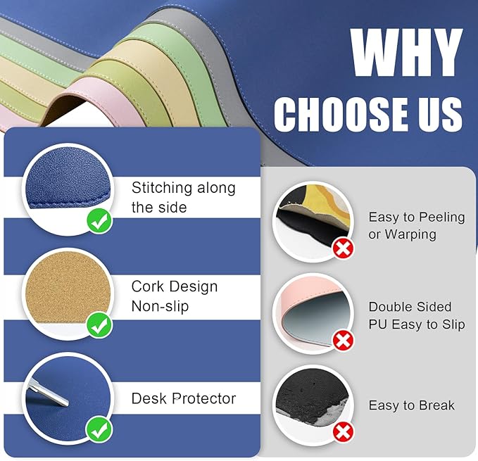 - 🖱️ 🖱️Superior Protection Mat for Desk: Durable PU leather and cork material, provide reliable protection for your desk surface. Safeguard your tabletop from everyday wear and tear with our Dual-Sided Desk Pad. This large mouse pad and desk mat combo is a protective barrier, preventing scratches, scuffs, and spills from damaging your workspace.