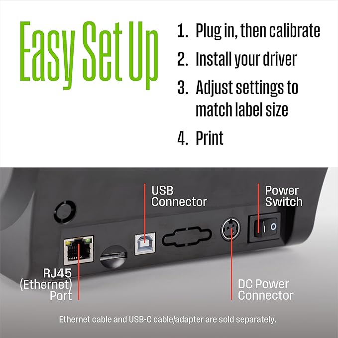 - PACKAGING CONTENTS: Printer, starter labels, label holder, USB flash drive, USB cable, power cord, and power adapter. Ethernet cable and USB-C cable/adapter are sold separately.
