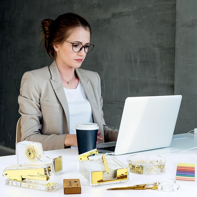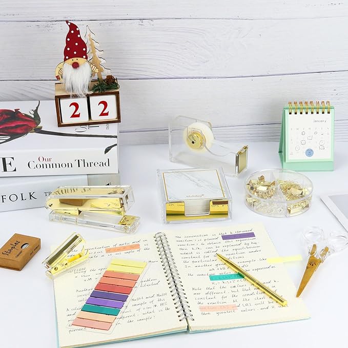Buqoo Gold Acrylic Sticky Notes Holder Stapler and Tape Dispenser Cutter with Staple Remover, Sticky Notes, Paper Clips, Scissor, Ballpoint Pen for School Home N Office Supplies
