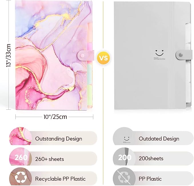 - ๐ฟ๐ถ๐๐๐ ๐๐ถ๐ ๐ถ๐ธ๐พ๐๐ ๐ถ๐๐น ๐ซ๐๐๐๐ถ๐ท๐๐: With an expandable spine design, our expanding file folder can hold 200-260 sheets without becoming bulky. It is a perfect alternative to a binder, fitting comfortably in your backpack, allowing easy transport of your paperwork!