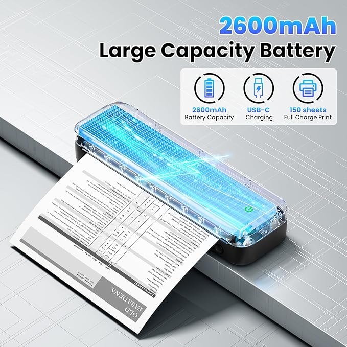 - Travel Printer - 300DPI Clear Printing and Long-lasting Battery: The compact printer is designed with high-definition printing technology, providing you with 300 DPI clear printing. And built-in 2600mAh rechargeable battery, mini printer can print up to 150 sheets on a full charge, must be a good travel partner