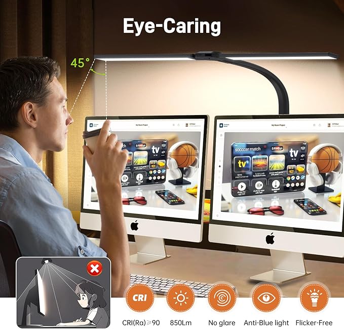 - 【Ultra Bright Wide & Light Induction Adjustment】Featuring a 31.5inch ultra-wide light strip, this desk lamp is suitable for both home and office desks, providing illumination across the entire workbench with a width of 71 inches. The high-efficiency 24W LED delivers evenly distributed light and ample brightness without flickering, making it ideal for use with large displays or workstations. When the ambient light becomes dim, the desk lamp automatically increases its brightness.