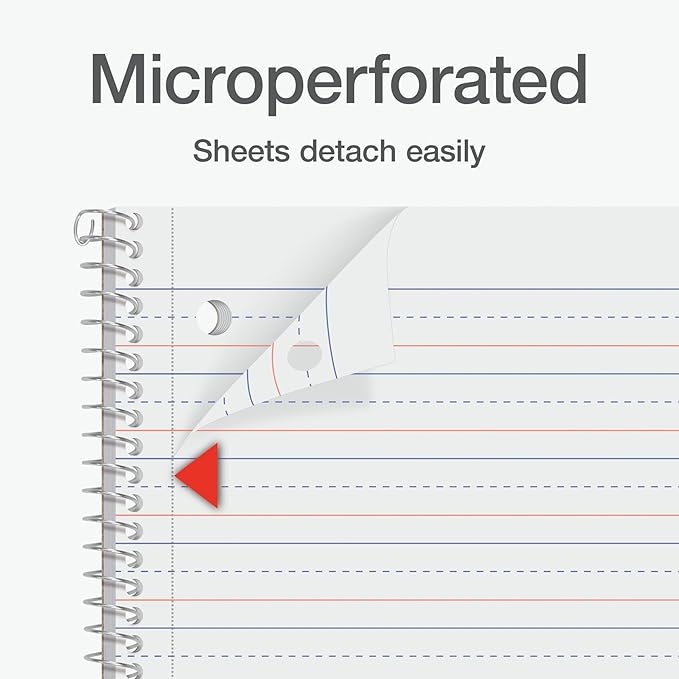 - The overall spiral notebook size is 8" x 10.5" and each perforated sheet tears out to 7.5" x 10.5"; 70 double sided sheets are 3-hole-punched to fit in your school binder