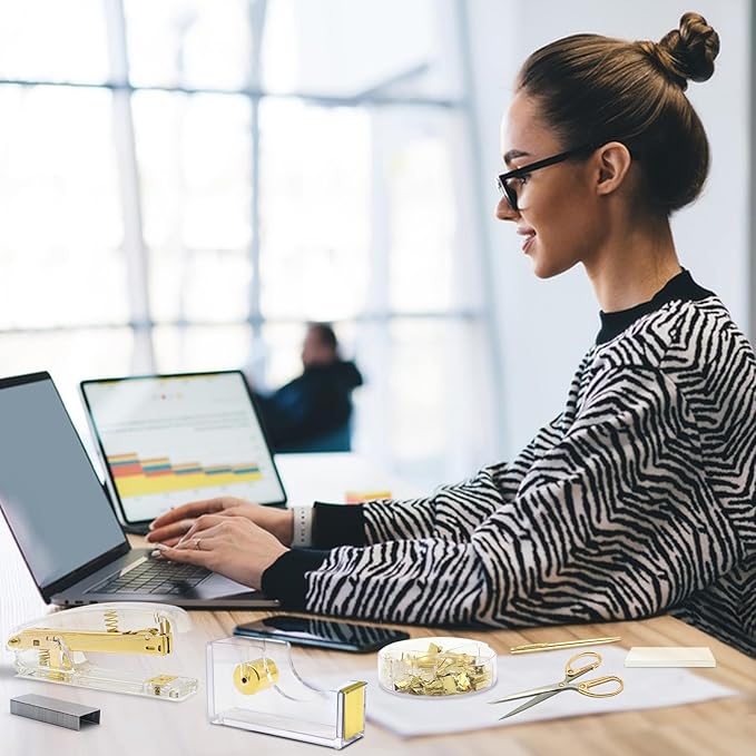 - Quality Material- Stapler and tape dispenser set made of high-quality acrylic material, which is reliable, clear and bright; gold desk accessories is smooth and comfortable to touch, not easy to break or deform, durable, elegant and beautiful,attach Bright colors easy to find,very suitable for daily work and study life.