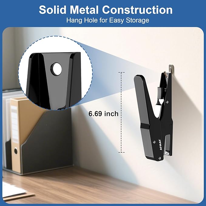- ✅DURABLE METAL CONSTRUCTION & LAST FOR YEARS: This stapling plier is constructed with solid metal and built to last from year to year. It's still working well even after 15000 times of punching tests! Being heavy duty for heavy use, but never being clunky. It is portable, space saving, and can be stored on the wall through the hanging hole. Use it anywhere and anytime with minimal grip force only, instead of batteries, electricity or power consumption.