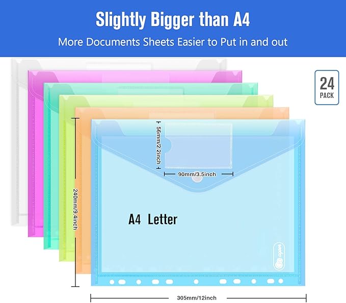 - 24 Pack Envelopes Document Folders - A4 Letter Size (12x 9.4 inches).This binder pocket has a large capacity and can easily hold more sheets Papers. Storing and sorting your documents, stationery, charts, invoices, Lego, crochet, photos, pictures, and more.