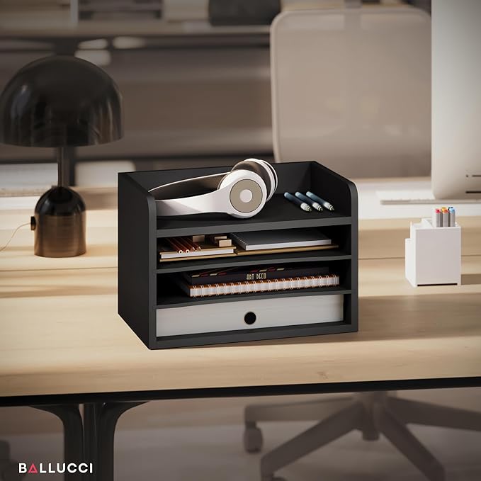 Ballucci File Organizer, 4-Tier Office Desk Organizer, Open Top Wood Paper Organizer for Classroom, Mail Sorter Paper Tray with Adjustable Storage Shelves, Black