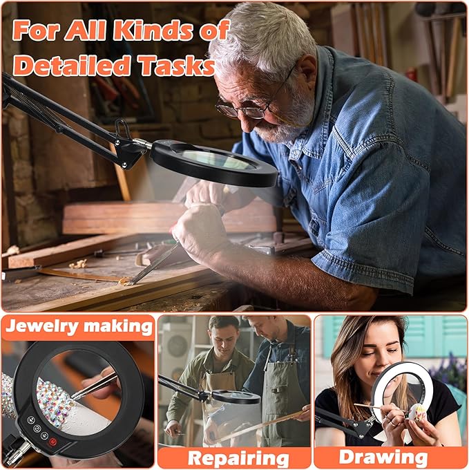 - Super Bright LED: Our desktop magnifying glass with light comes with 5 color modes and adjustable brightness. It features a memory function and eye protection, making it perfect for professionals like estheticians, jewelers, artists, seniors, and crafters. It’s also design for anyone who frequently uses their eyes for tasks such as solder, nail work, needlepoint, and book reading, coin checking ect.