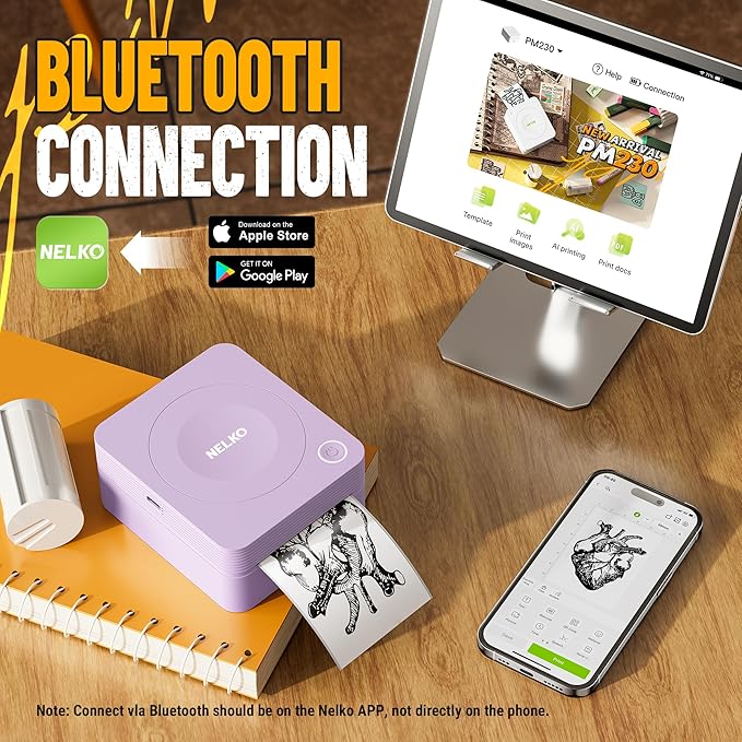 - Bluetooth Connection: NELKO mini sticker printer compatible with IOS & Android Phone via bluetooth connection. Step 1: Download "Nelko" APP from Google Play or App Store. Step 2: Long press the printer switch and the white light flashes. Step 3: Turn on the phone bluetooth. Step 4: Open the"Nelko" App and click "Un connected", refresh and click "PM230" and connect. To start printing, please refer to the instructions and follow the instructions. Does not support computer printing