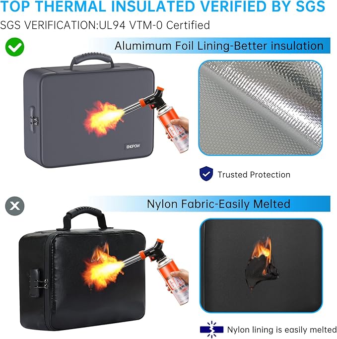 - Fireproof and Water-resistant: The multi-Layer file organizer is made of silicone coated material and aluminum foil which withstand the temperature up to 5200℉(double safe protection).Aluminum foil lining isn’t easily melt under high temperature after several tests. It has been passed by SGS TEST(UL94 VTM-0 Certified).The bag is fireproof and Water-resistant, which can effectively protect your important documents in a fire,flood,and wet weather. They will further keep your files intact
