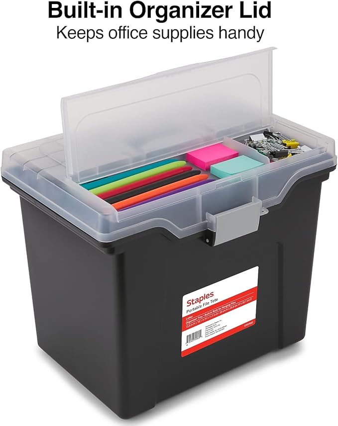 STAPLES File Folder Tote, Portable Filing Box, Letter Size Hanging Folders, Security Latch & Built-In Lid Organizer, Black/Clear