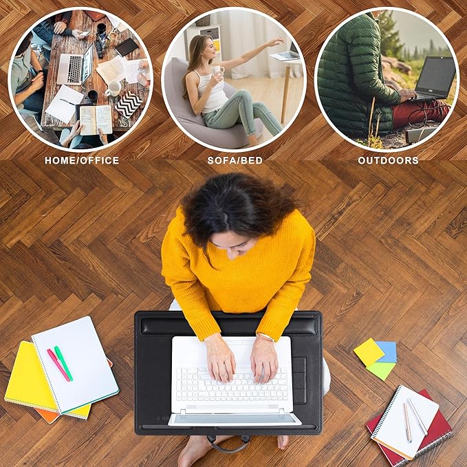 CENNBIE Leather Lap Desk with Memory Foam Cushion 24x16 Inches- Adjustable Portable Laptop Tray Fits 17 19 Inch Notebook - Built-in Wrist Rest Lightweight Computer Desk (Black)