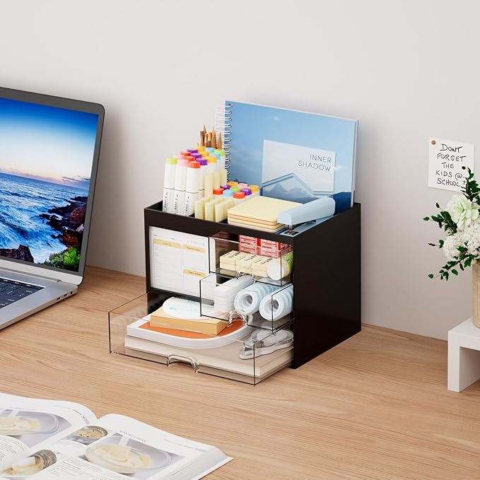Marbrasse Desk Organizer with 3 Drawer, Multi-Functional Pencil Pen Holder for Desk, Desk Organizers and Accessories with 4 Compartments, Desktop Organizer Storage for Office Home Art Supplies (Black)