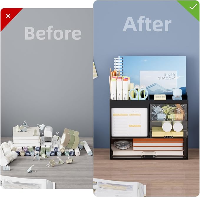 - 【Multifuction Desk Organizer】This Desk Caddy is no installation required not only perfect for storing your desktop stationery and many other desk widgets but is also great for storing your makeup brushes, nail polishes, lipsticks, and other small personal items sorted by type. The transparent drawer makes it way easier to find what you need! and You can put any other daily necessities on the organizer, It helps you keep your stuff organized