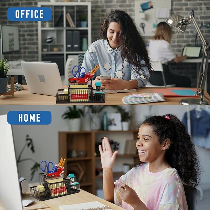 - Desktop Supply Caddy holds and organizes notepads, pens, pencils, highlighters, staplers, sticky notes, binders, sharpeners, scissors, rulers and so on.