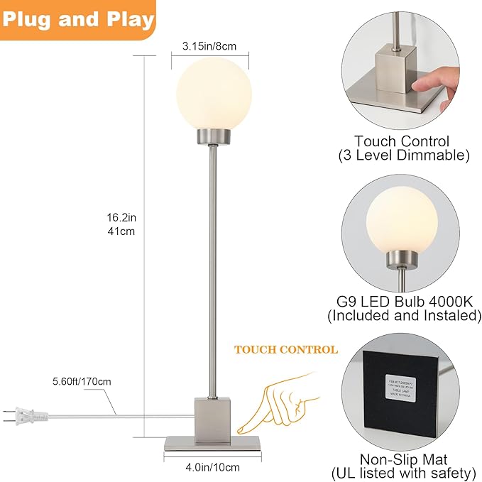 - 🔥Touch Control: You can touch anywhere on the metal base to 3-Way Dimmable touch control this table lamp! This desk lamp is NOT battery-operated and rechargeable. It is 120V ~ 60Hz with cord and plug, G9 Bulb(included and installed).