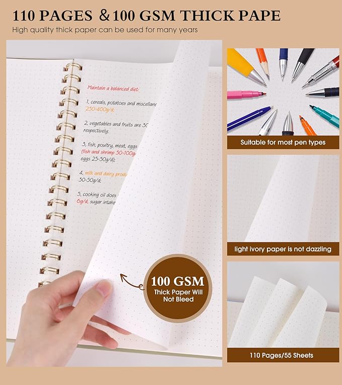 - 【A4 Dotted Spiral Journal Notebook】 Large a4 size 8.5"x11" dotted notebook, standard 5mmx5mm dot grid spacing to keep your notes organized, creating a smooth writing experience. The professional sturdy water-resistant plastic hard cover will protect your bullet notebooks to last for years, which has oil-resistant and anti-bending properties, effectively protecting the internal paper of the journal and provides a comfortable writing surface.