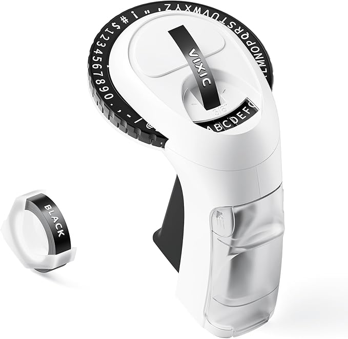 - Easy-to-Use Embossing Label Maker - Vixic Embossed Label Maker Manual is extremely user-friendly. Simply rotate the dial to select letters, various punctuation marks, or numbers, then squeeze the handle to print a 3D embossing effect tape. Additionally. Retro embossing label maker machine with tape built-in cutting design and pre-cut dividers make it convenient to peel off labels, while the dotted lines facilitate hassle-free labeling (Use tips: 1.Please make sure the symbols on the dial are aligned before use. 2.the more pressure you apply, the clearer the print will be - hold for a few seconds)