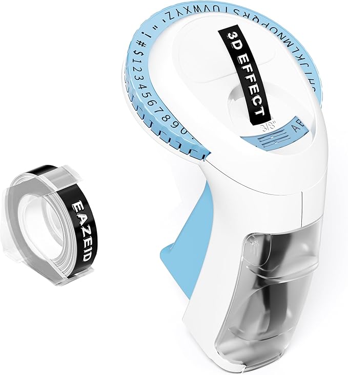 - Ergonomic Design Labeler : EazeID 3D Embossed Label Maker features an ergonomically designed handle for easy pressing. The built-in cutting design and pre-cut dividers make it convenient to peel off labels, while the dotted lines facilitate hassle-free labeling