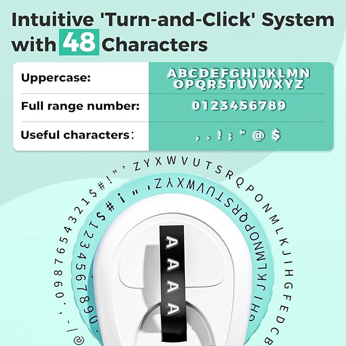 - Simple Label Maker: The Portable Embossing Label Maker with a turn-and-click system simplifies the labeling process, offering 48 useful characters. English letters "A TO Z", numbers : "0 to 9 " , and common symbols " - ! @. , !‘“ $ # ". Sufficient to meet your use needs