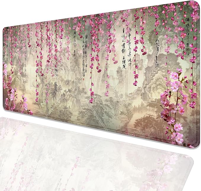 Mountains Flowers and Words Desk Pad Mouse Pad,Large Gaming Chinese Style Mouse Mat with Stitched Edges,Non-Slip Waterproof Rubber Base Mousepad for Office Work Home Desk Mat(27.5X11.8 in)