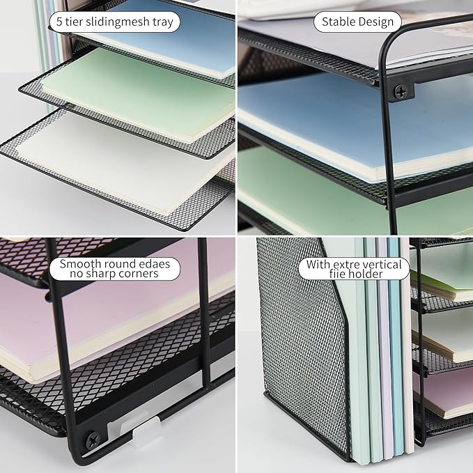 - 【Ideal Desk Organizers and Accessories】OPNICE newly releases the desktop file organizer! This office organization features 5-tier sliding mesh trays and a side vertical magazine file holder, providing ample space for all your office supplies and desk accessories while keeping your workspace neat and efficient