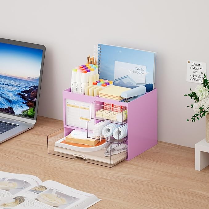 Marbrasse Desk Organizer with 3 Drawer, Multi-Functional Pencil Pen Holder, Desk Organizers and Accessories with 4 Compartments,Desktop Organizer Storage for Office Home Art Supplies (Purple)