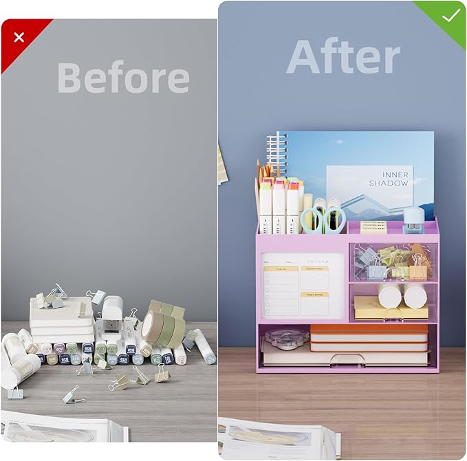 - 【Multifuction Desk Organizer】This Desk Caddy is no installation required not only perfect for storing your desktop stationery and many other desk widgets but is also great for storing your makeup brushes, nail polishes, lipsticks, and other small personal items sorted by type. The transparent drawer makes it way easier to find what you need! and You can put any other daily necessities on the organizer, It helps you keep your stuff organized