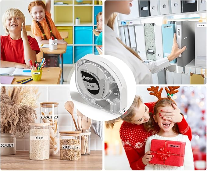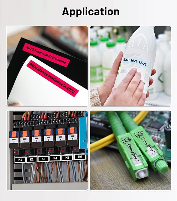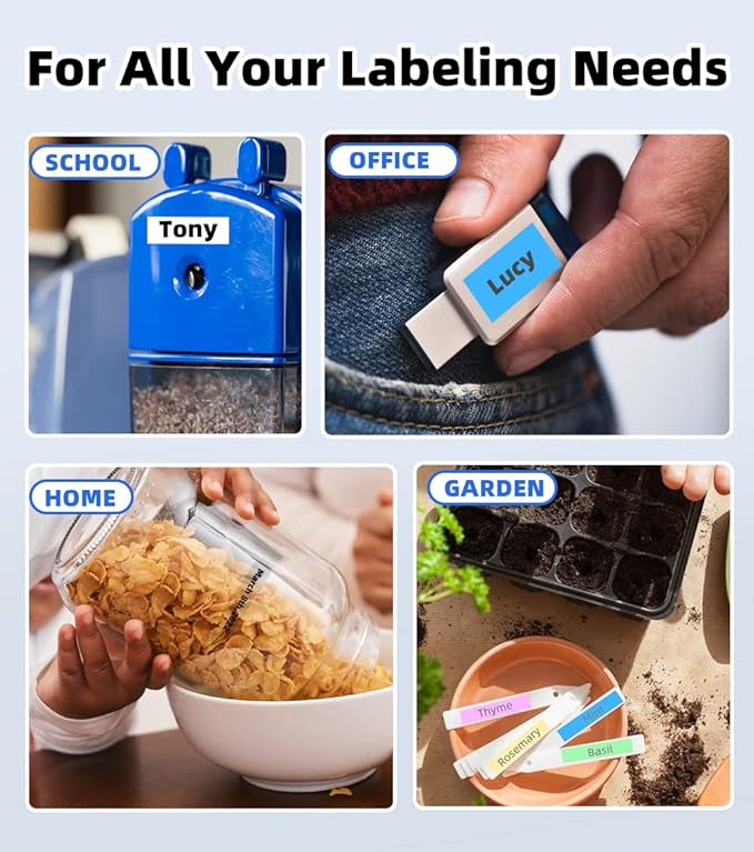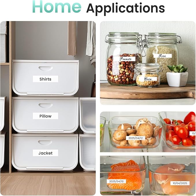 - Ideal for Home and Organization: Handheld label makers widely used for industrial, organization (jars, cupboards, crates, spice jar lids, remotes, smart products,organizers, food dates, cosmetics, kitchen, etc.) garage organization (switchboards, gears, cables and wires, etc.) outdoor organization, or school and office supplies organization (name tags, folders, files, notes, etc.) ribbon label printer can also print text on ribbon through thermal transfer technology on the Ribbon can also print text on the ribbon by heat transfer technology to customize one-of-a-kind gifts, which is the first choice for Christmas gifts, anniversaries, holidays, and crafts making