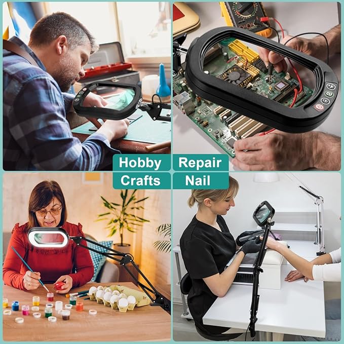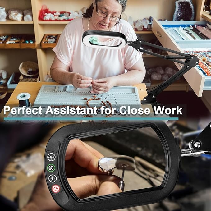 - Flexible Adjustment & Swing Arms: The magnifier is equipped with two linked metal swing arms, four springs, and three rotary knobs, providing maximum flexibility. Each arm extends up to 8.9", allowing precise positioning. The 360° rotating light head ensures illumination from any angle, while the locking knobs keep everything stable. Perfect for delicate tasks like crafting, painting, or repairing small electronics, it offers optimum lighting and adjustability.
