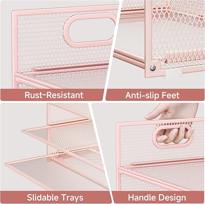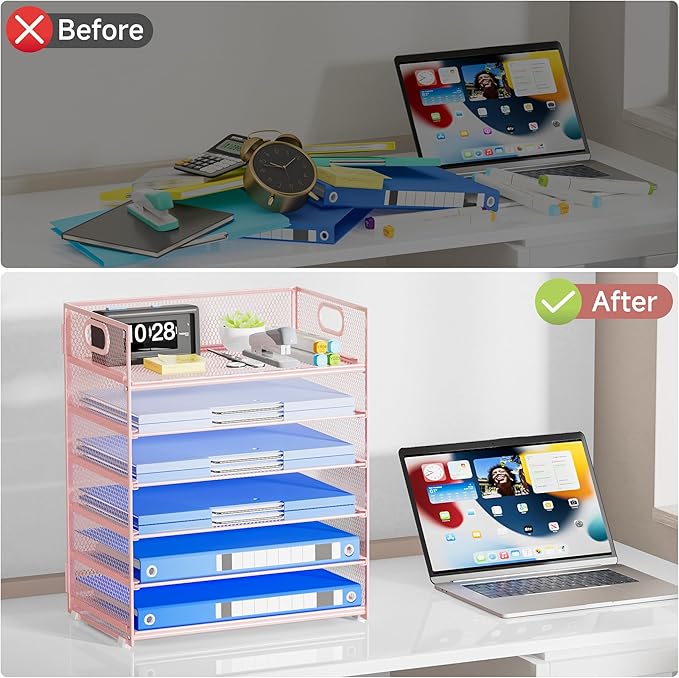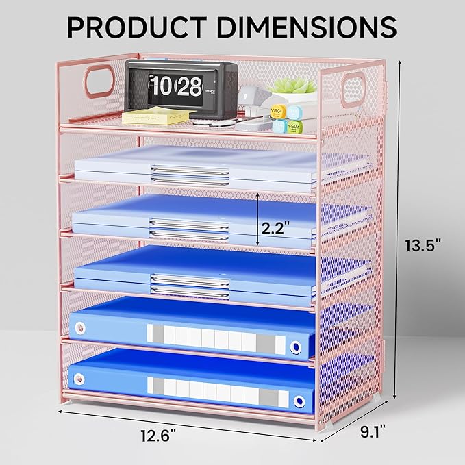 6-Tier Mesh Paper Organizer, Pink Letter Tray with Handle, Office Desk Accessories, 12.6L x 9.1W x 13.5H inches