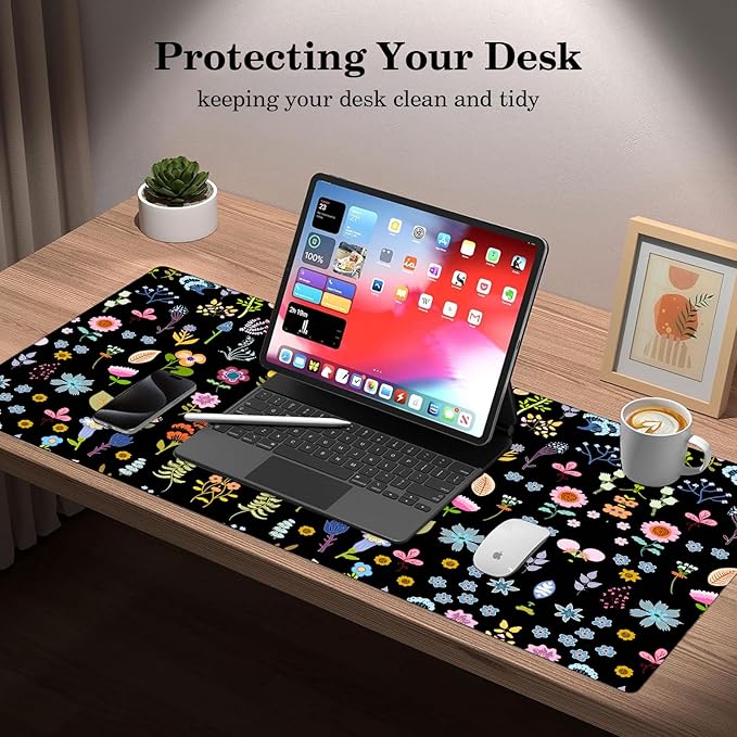 Flower Pad Protector, Floral Stitched Edges Mouse Pad, Large Office Mat, Non-Slip Desk Blotter, Laptop Desk Pad, Writing Pad for Office and Home (31.5" x 15.7")