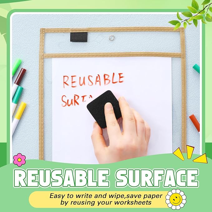 - Reusable Dry Erase Pocket Sleeves: these oversized, durable and waterproof sleeves are made of PE plastic and are nice; Dry erase mini markers being reusable, they are cost effective by saving paper and printing costs; You can write and wipe off on both sides, keeping your work neat and tidy