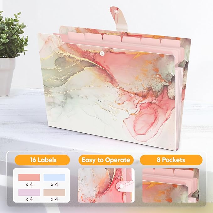Expanding File Folder, Folders for Important Documents Organizer, Accordion File Organizer, Aesthetic Folders for School Students, 8 Pockets File Folder for Home Bills (White Gold Marble)