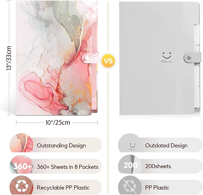 - Easy Transport and Adequate Capacity: With an expandable spine design, our expanding file folder can hold 200-260 sheets without becoming bulky. It is a perfect alternative to a binder, fitting comfortably in your backpack, allowing easy transport of your paperwork!