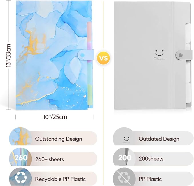 - Easy Transport and Adequate Capacity: With an expandable spine design, our expanding file folder can hold 200-260 sheets without becoming bulky. It is a perfect alternative to a binder, fitting comfortably in your backpack, allowing easy transport of your paperwork!