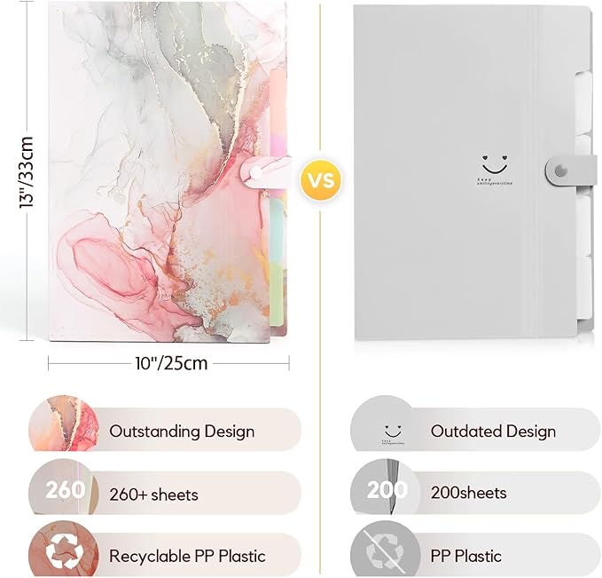 - Easy Transport and Adequate Capacity: With an expandable spine design, our expanding file folder can hold 200-260 sheets without becoming bulky. It is a perfect alternative to a binder, fitting comfortably in your backpack, allowing easy transport of your paperwork!