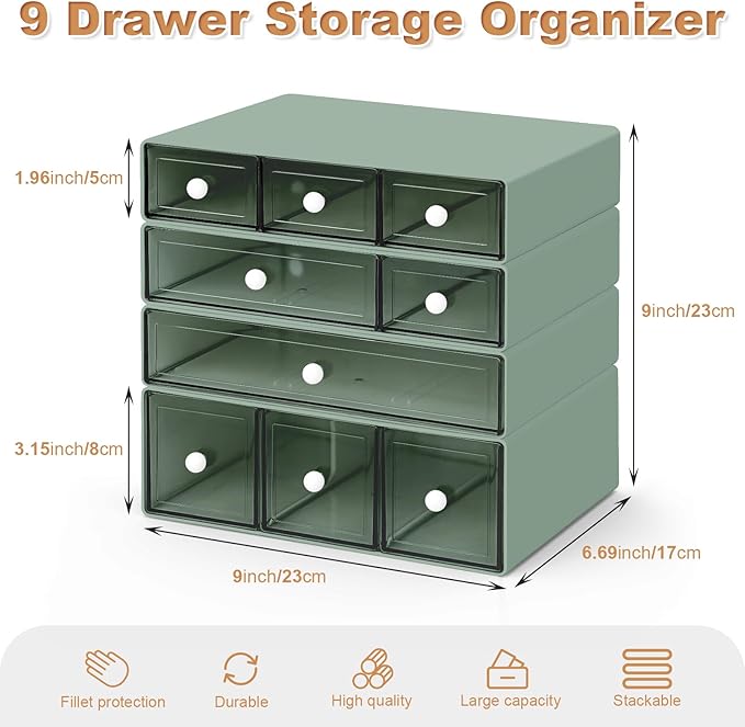 - Perfect Size & Stackable: 4 tiers Desktop Organizer with 9 Drawers, contains three conventional sizes of 23x17x5cm and one raised size of 23*17*8cm. Stackable desktop storage boxes create vertical storage and free up space.You can freely stack according to your preferences and needs