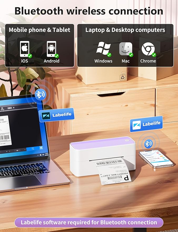 - [Print Via Bluetooth] - Phomemo bluetooth shipping label printer supports wireless printing through bluetooth connection. For IOS and Android mobile Phone, need to download the "labelife " APP from Apple Store or Google Play. With easy and simple operations, you can easily print your logo, labels, and more, making your life more convenient! Note: All devices cannot be directly connected to Bluetooth and need to be used through the app
